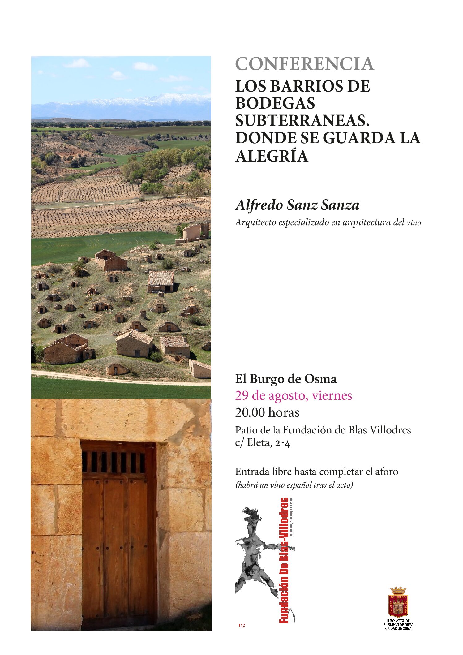 Fundación Blas Villodres C/Eleta 2-4, El Burgo de OsmaEl arquitecto Alfredo Sanz Sanza, especialista en arquitectura del vino, nos guiará por el fascinante mundo de los barrios de bodegas subterráneas, verdaderos santuarios del paisaje cultural del vino.
